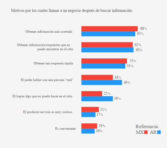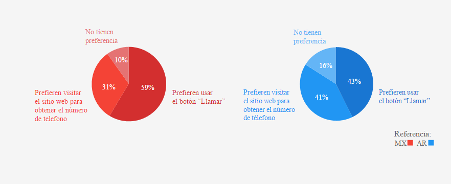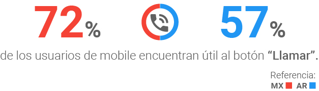 Poder llamar inmediatamente con un botón en el resultado de búsqueda fue considerado como muy importante por el 76% de los encuestados en México y por el 61%, en la Argentina. Tan valioso fue este punto para los consumidores, que el 63% en el país del hemisferio norte y la mitad de los consultados en el del sur, declararon que buscarían otro negocio si es que no podían comunicarse de esta manera.