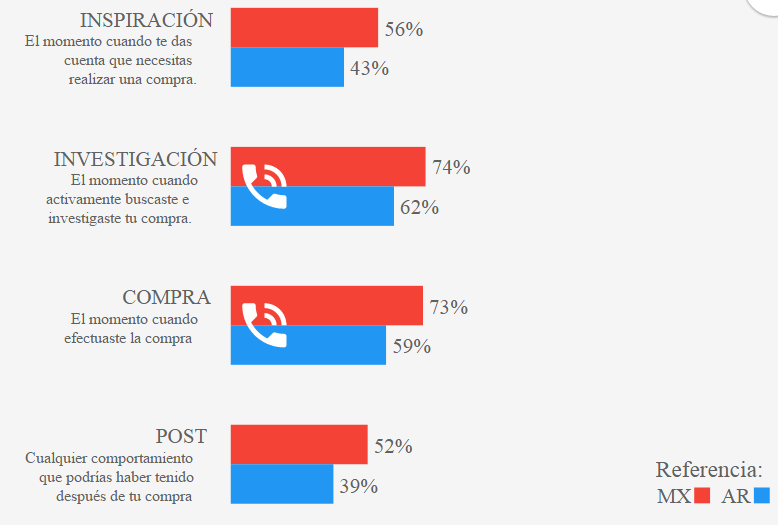 Más: en México, casi la mitad de los consumidores que hicieron búsquedas en un smartphone declara hacer una llamada frecuentemente antes de realizar una compra. En la Argentina, es apenas un poco menor: el 40%.